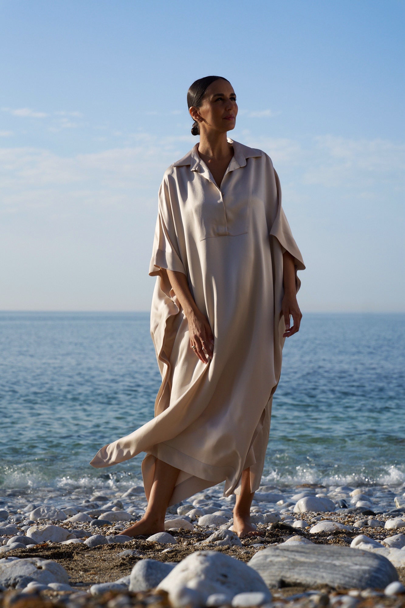 De iconische Dress Muze van Souâd Feriani, nu in een luxueuze cady-stof – voor een elegante en verfijnde uitstraling met net dat beetje extra structuur. Deze versie behoudt de kenmerkende losvallende snit, kraag en vleermuismouwen, maar krijgt dankzij het zwaardere, licht matte materiaal een meer geklede, sculpturale look.