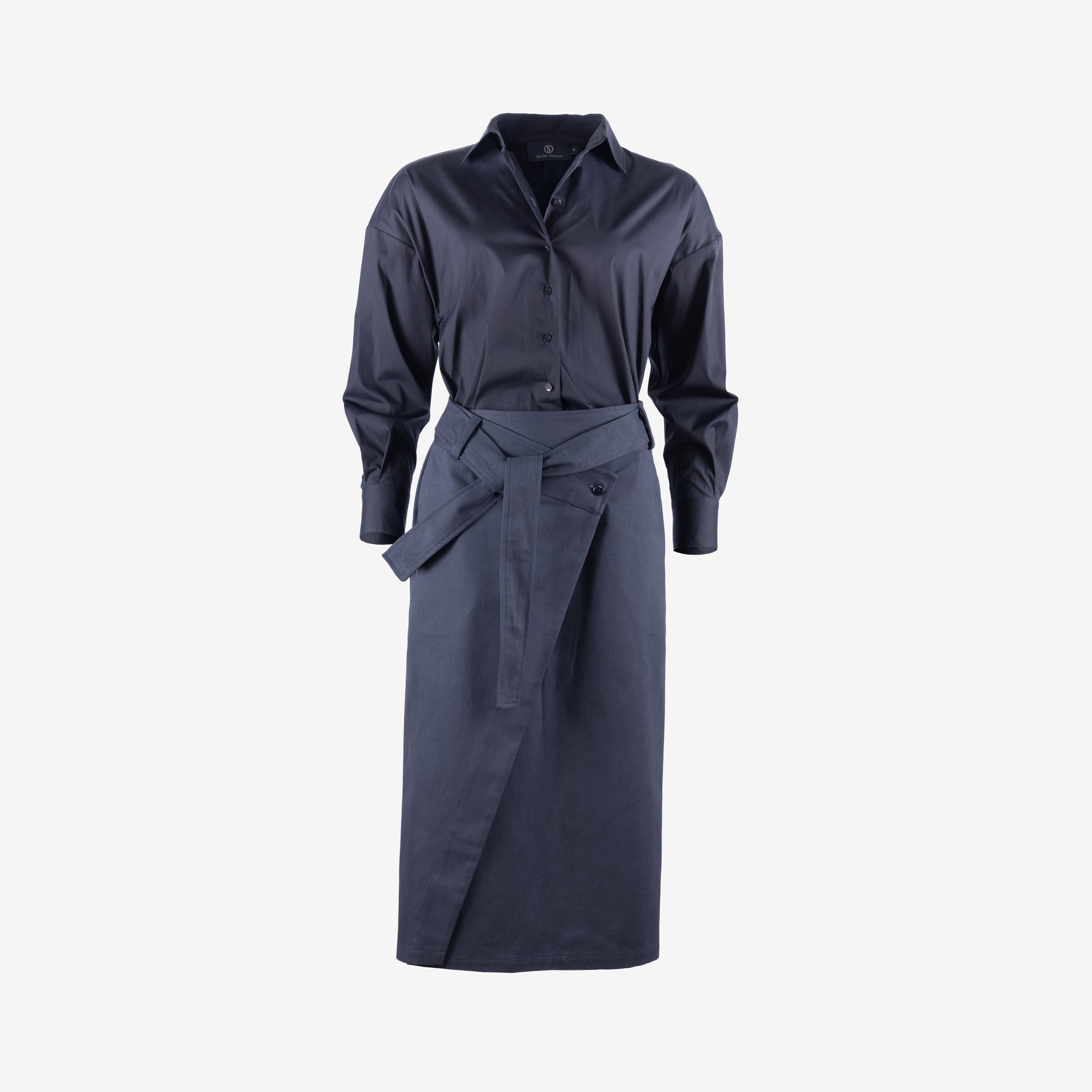 Het bovenstuk is uitgevoerd als een katoenen hemd met een frisse, gestructureerde uitstraling. De rok in 100% katoen heeft een asymmetrische overslag die beweging en verfijning toevoegt aan het ontwerp. De bijhorende katoenen riem accentueert de taille en laat toe het silhouet naar wens te definiëren.