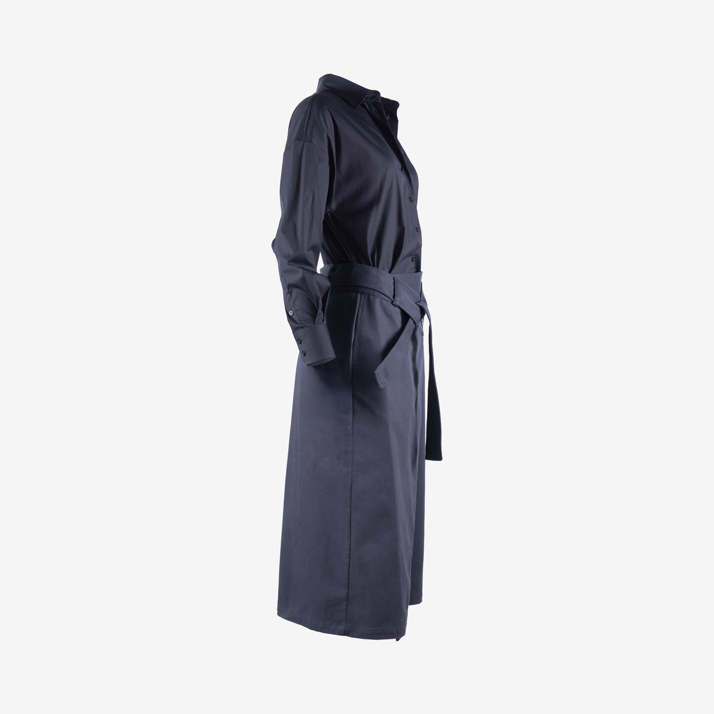 De Klara jurk combineert het nonchalante karakter van een hemd met de vrouwelijke elegantie van een overslagrok. Dit unieke ontwerp bestaat uit twee delen die subtiel aan elkaar verbonden zijn en samen één harmonieus silhouet vormen.