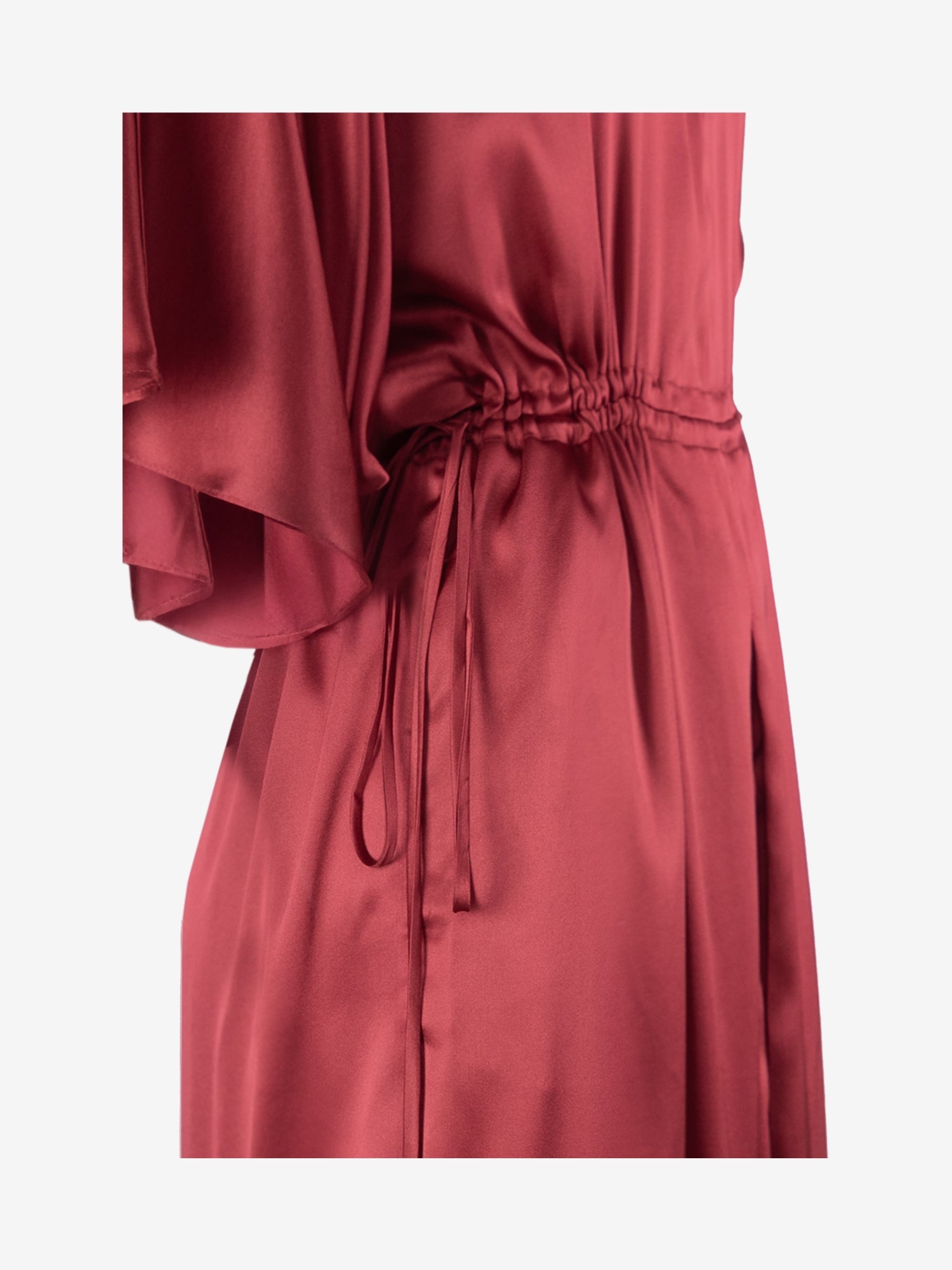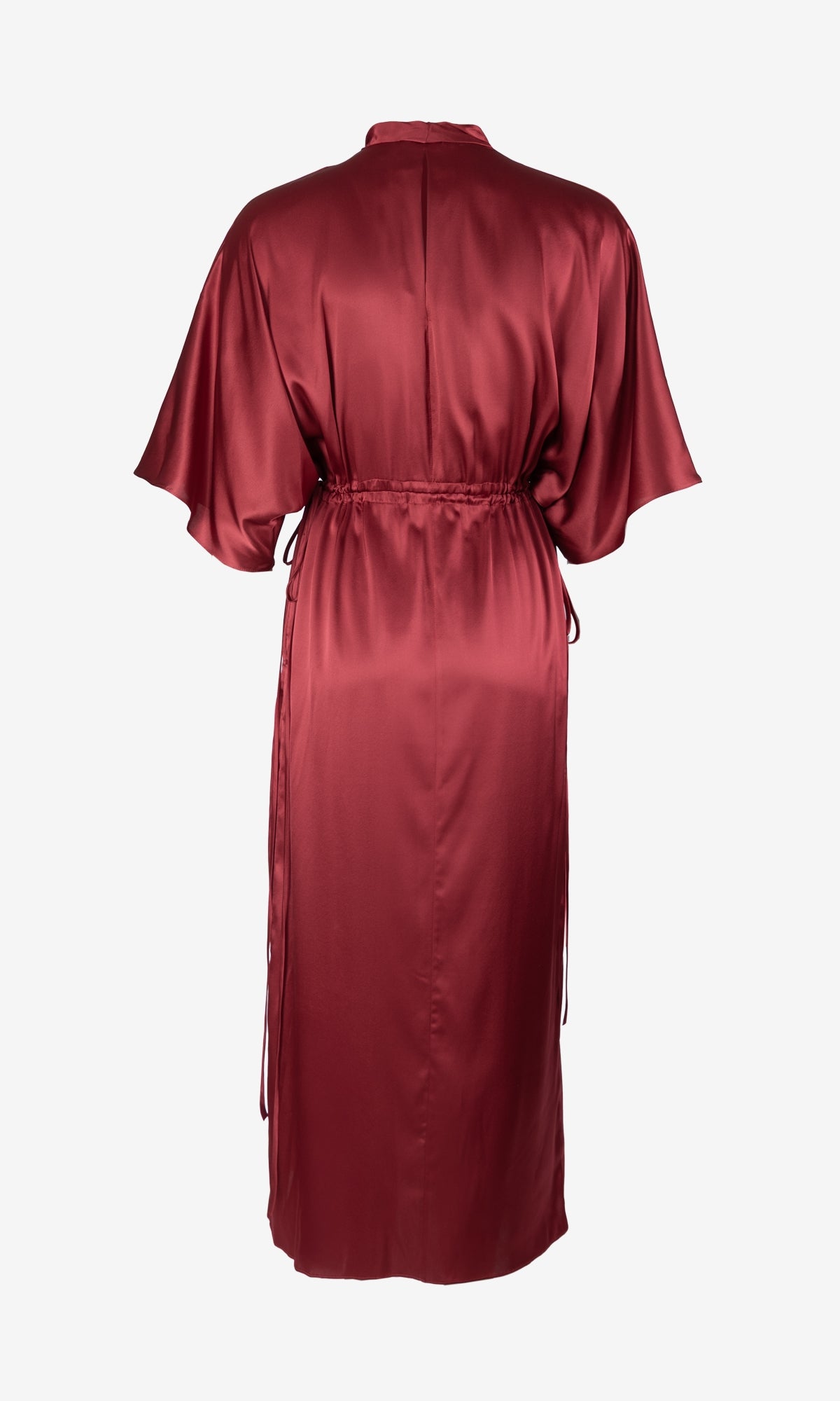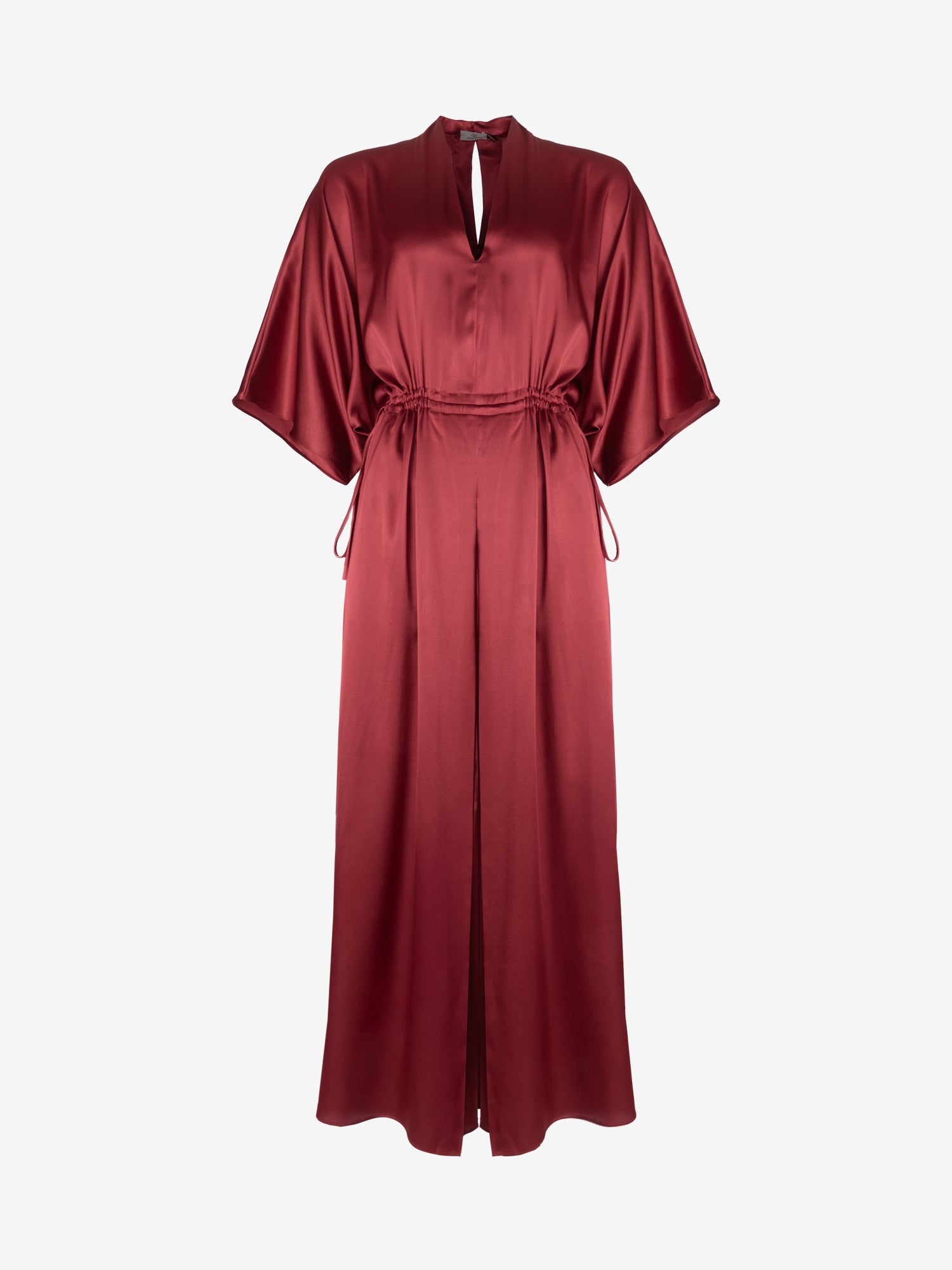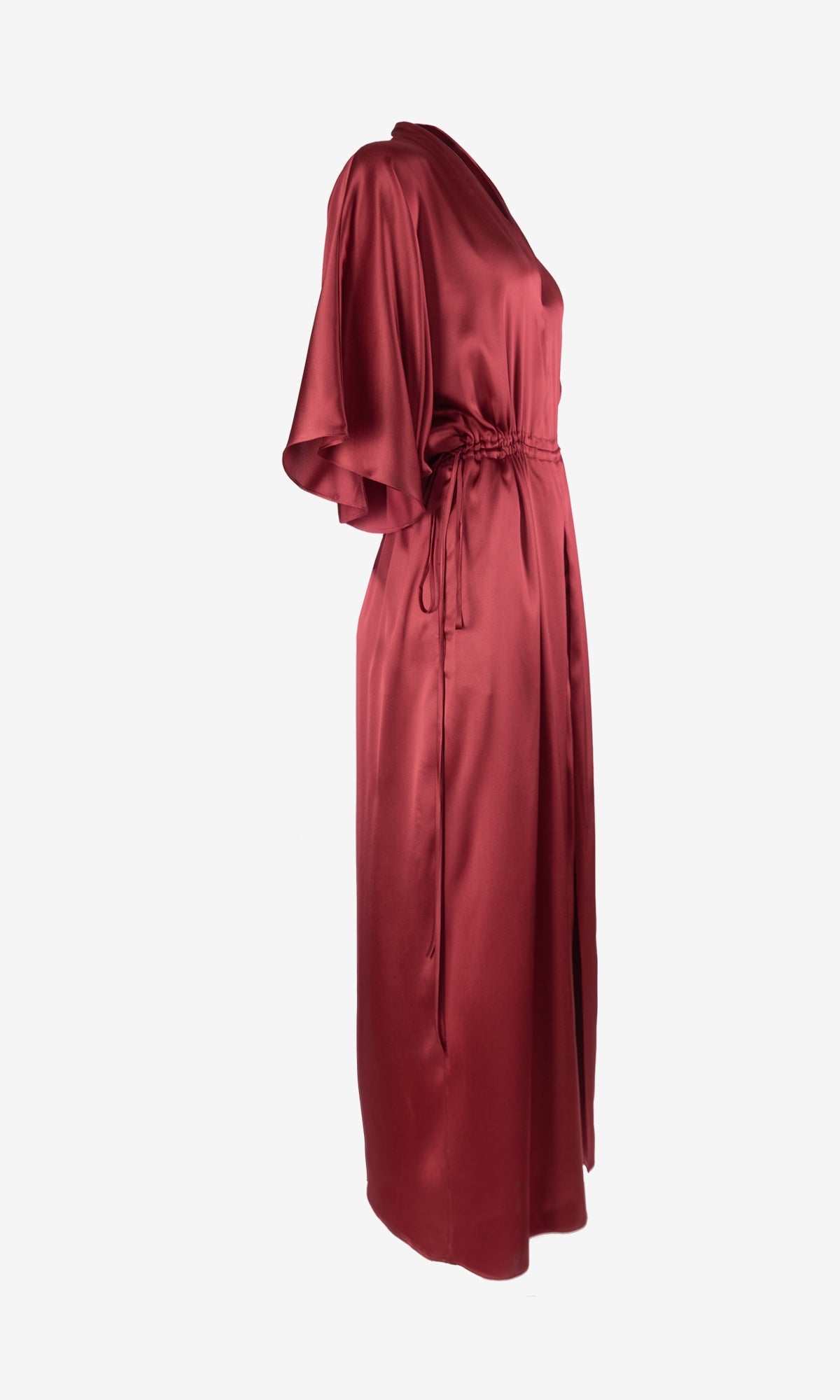 The relaxed kimono-style sleeves create an effortless silhouette, while the delicate drawstring waist subtly defines the figure. A deep V-neckline and a long, flowing skirt add a refined and modern touch.